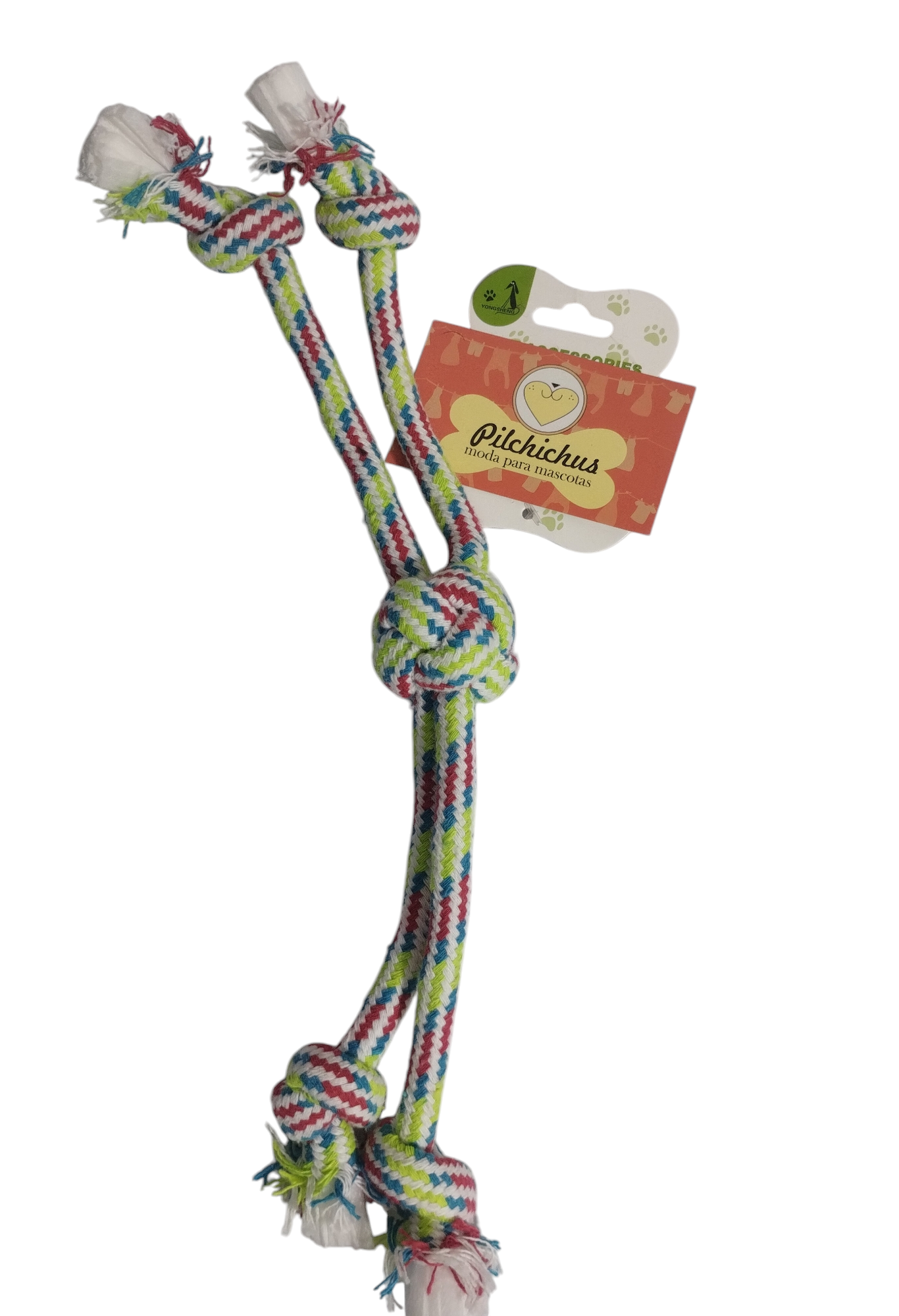 Soga con nudo para perros pequeños es un juguete diseñado para proporcionar entretenimiento y fortalecer la mordida de tu mascota. Generalmente está hecha de materiales resistentes como algodón, poliéster o cuerda trenzada, lo que ayuda a limpiar los dientes y masajear las encías mientras el perro mastica o juega con ella.